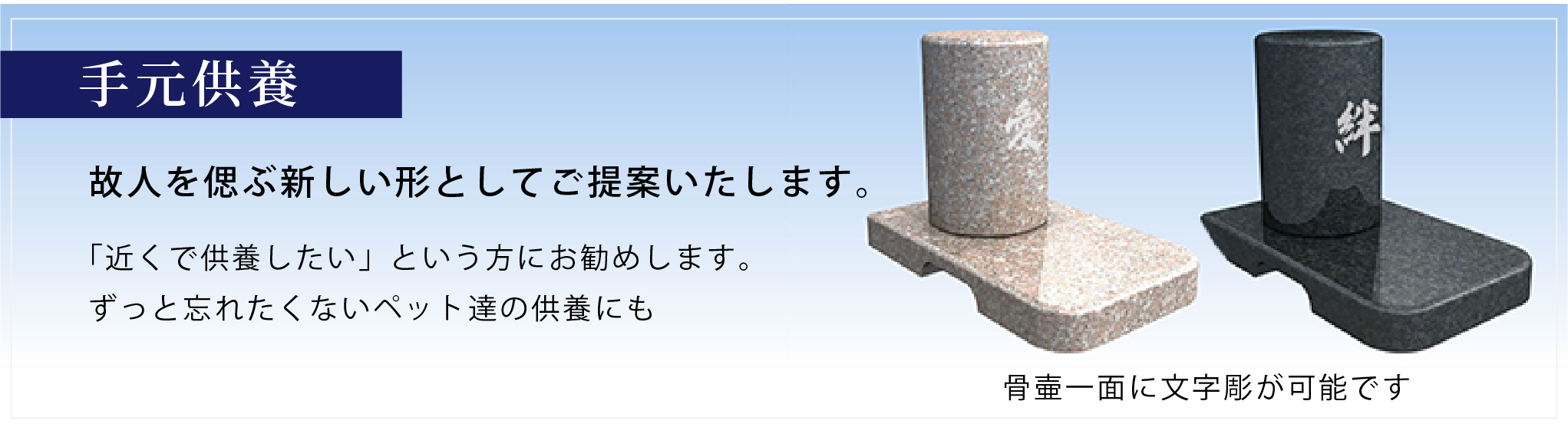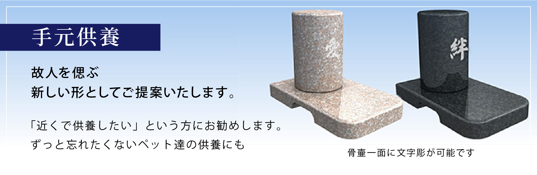 地域密着・安心価格 ! 迅速で細やかなご提案をさせていただきます。 続きを読む お墓を建てたい お墓の構造について お墓を建てるまでの流れ 霊園紹介 墓石・石材 石材について 和型墓石について 洋型墓石について お墓のメンテナンス お墓のリフォーム お引越し / 撤去 お墓の掃除代行 /クリーニング